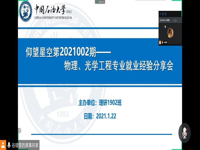 2021年1月22日下午三点,理研1902班通过腾讯会议的方式成功举办物理、光学工程就业经验分享会。本次会议由理研1902班班长谷靖雯主持,邀请2018届研究生郝海晓、付强、杨金伟向即将面临择业的同学们分享了他们在求职过程中的心得体会和宝贵经验。理研1902班全体同学与会讨论学习。