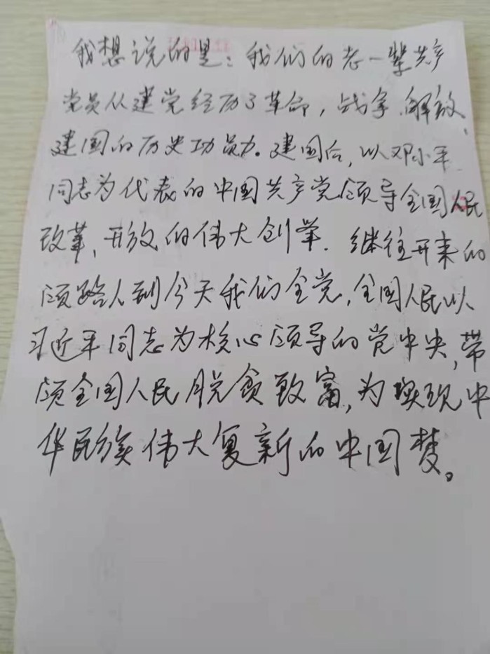 参观革命旧址结束后,调研队继续拜访一些优秀党员。朱义清是一位有着二十多年党龄的老党员,在建党一百周年之际,他感慨道,我们的老一辈共产党员从建党经历了革命、战争、解放、建国的历史进程。中华人民共和国成立后,以邓小平同志为代表的中国共产党领导全国人民进行改革开放,时至今日,国家在新一代领路人的带领下朝着中国梦的前进方向迈进。