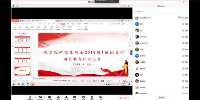 4月13日上午11点,理研1901班组织开展线上团员教育评议工作会议,此次会议由理研1901班团支书夏荷主持,必赢线路检测中心研究生辅导员田方出席本次会议,理研1901班全体同学参与。