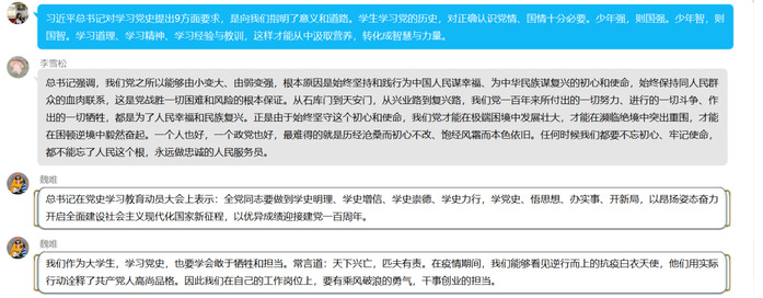 学生学习党的历史,对正确认识党情、国情十分必要。少年强,则国强。少年智,则国智。理科实验班1801团支部成员均表达对习近平总书记所提内容的赞同,表现了认真学习党史的决心。