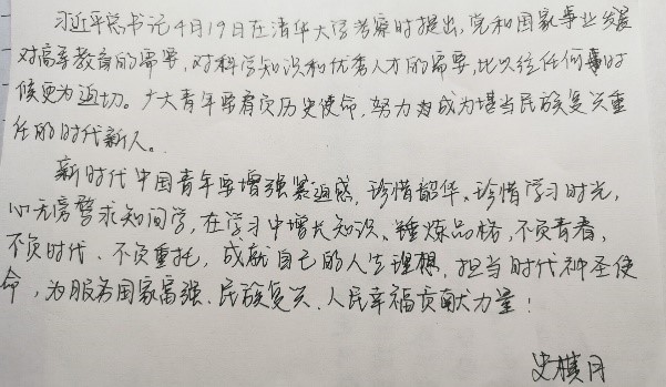 通过深入学习贯彻习近平总书记在清华大学考察时的重要讲话精神,团员们都有自己的理解与感悟,因此,团支书号召大家写下感悟,互相交流,加深对习近平总书记重要讲话的理解与认识。通过对习近平总书记重要讲话精神的学习,团员们了解到党和国家事业发展对高等教育的需要,对科学知识和优秀人才的需要,比以往任何时候都更为迫切。