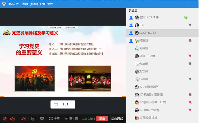 2021年5月16日上午9点,理实1703团支部组织同学们线上开展了“学党史、跟党走、做新时代青年”党史学习教育主题团日活动,此次会议由理实1703团支部书记李伟主持,采用线上学习的方式,以宿舍为单位线下共同学习,支部全体团员参与学习。