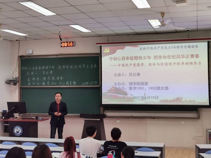 2021年7月1日,数学19级团支部在西环103举行了以“守初心百年征程恰少年 担使命世纪风华正青春——中国共产党愿景、使命与价值观中的卓越领导力”为主题的团日活动,此次活动由吕云涛副教授主讲,数学1901、1902团支部所有同学共同参与。本次活动主要从中国共产党愿景、使命价值观中的卓越领导力、不忘初心、、牢记使命以及青春心向党、奋进新征程三部分为主,插入了视频、小游戏、红色经典诵读等部分。