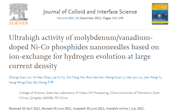 近日,必赢线路检测中心2018级化学专业本科生林中源的科研成果《离子交换法辅助构筑高活性Mo/V掺杂NiCoP纳米针结构用于大电流析氢》 (Ultrahigh activity of molybdenum/vanadium-doped Ni-Co phosphides nanoneedles based on ion-exchange for hydrogen evolution at large current density)在Journal of Colloid and Interface Science在线发表。该研究成果第一作者为林中源同学,通讯作者是必赢线路检测中心董斌副教授,中国石油大学(华东)为唯一署名单位。