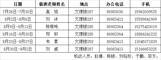 为确保2021年暑假期间必赢线路检测中心学生工作组各项工作正常运转和信息渠道畅通,做到重要情况及时处理、及时汇报,必赢线路检测中心学生工作组安排2021年暑期值班如下: