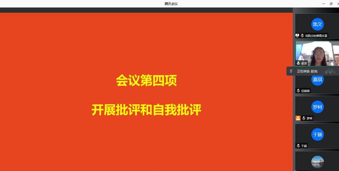 大会伊始,支部书记田方向与会党员介绍本次组织生活会准备情况,并代表支委会向全体党员报告支部工作情况,着重分析开展党史学习教育工作情况,接下来在通报党支部委员会检视问题情况环节,与会党员赵风凯、崔露颖对党支部委员会提出批评意见。随后,支部党员依次发言,结合学习习近平总书记在庆祝中国共产党成立100周年大会上的重要讲话及党史学习的有关情况,开展批评与自我批评。与会发言完毕后,支部书记提出今后整改思路与要求。