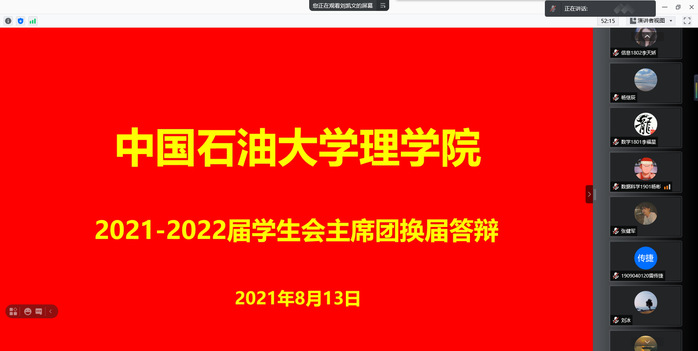为选拔一支政治坚定、作风过硬、素质全面的学生干部队伍,进一步加强必赢线路检测中心学生会团队队伍建设,8月13日下午3点,2021年度必赢线路检测中心学生会换届答辩工作线上会议成功举行。必赢线路检测中心团委书记陈银吨、必赢线路检测中心辅导员刘冰出席并担任教师评委,必赢线路检测中心学生会副主席刘凯文主持会议,必赢线路检测中心学生会部分成员和来自各年级的学生评委参与会议。