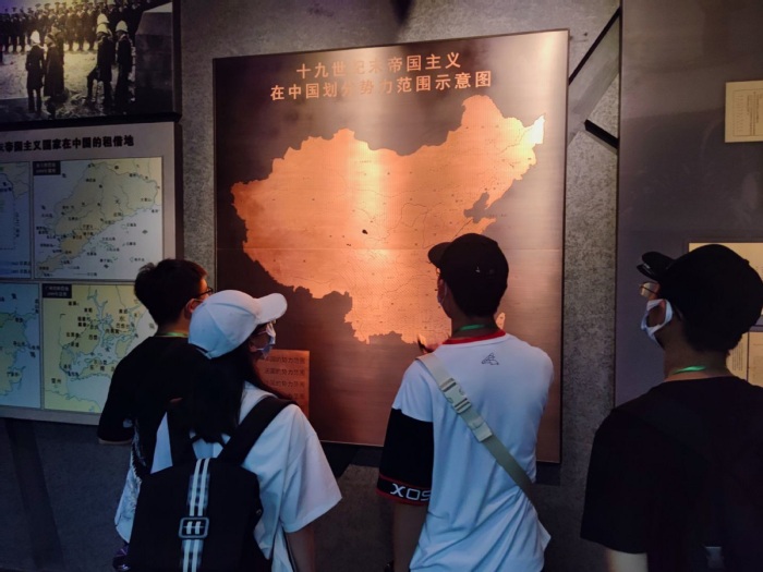实践队员也发现博物馆多元的展示方式也极大的提升了参观人员的参观体验。青岛一战遗址博物馆除了利用简单的展品展出和人工讲解的模式以外,还通过历史短片以及自制动画的方式生动形象地介绍了青岛建置的发展历程、帝国主义给人民带来的苦难以及人民对殖民统治的抗争;运用影像技术模拟还原了胶济铁路的沿线风光,走进列车车厢,看着“窗外”不断闪过的站名和标志性建筑,实践队员不禁感叹科技的进步和历史的变迁;运用声光技术对中国普通民众苦难生活进行了还原,阴霾的天空、干枯的土地、衣衫褴褛的老翁等形象描绘了近代中国下层民众的艰苦生活,实践队员也情绪低沉,感同身受;运用投影技术,让参观者跨越时空与一百年前参加五四运动的学生们一同,高喊着“誓死力争,还我青岛”的口号。百年前的历史风云,中国人民的苦难,青年学生的抗争,宛若眼前,生动再现,让实践队员深受震撼、热血沸腾。