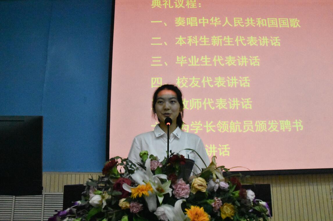 数学与应用数学专业2010级学生朱建伟作为校友代表发言,他结合自身的成长故事向新生分享了三个关键词:第一个关键词是“选择与坚持”,他鼓励同学们要尽早树立目标,并付诸三年如一日的努力,最终成功将会如期而至;第二个关键词是“主动性”,他建议同学们要培养主动性这一品质,从内心里主动去做事情、去做成事情;第三个关键词是“走出去”,他强调,高原出高峰,只有见识到更广阔的天地,才能收获更大的成长,进而实现伟大的理想。
