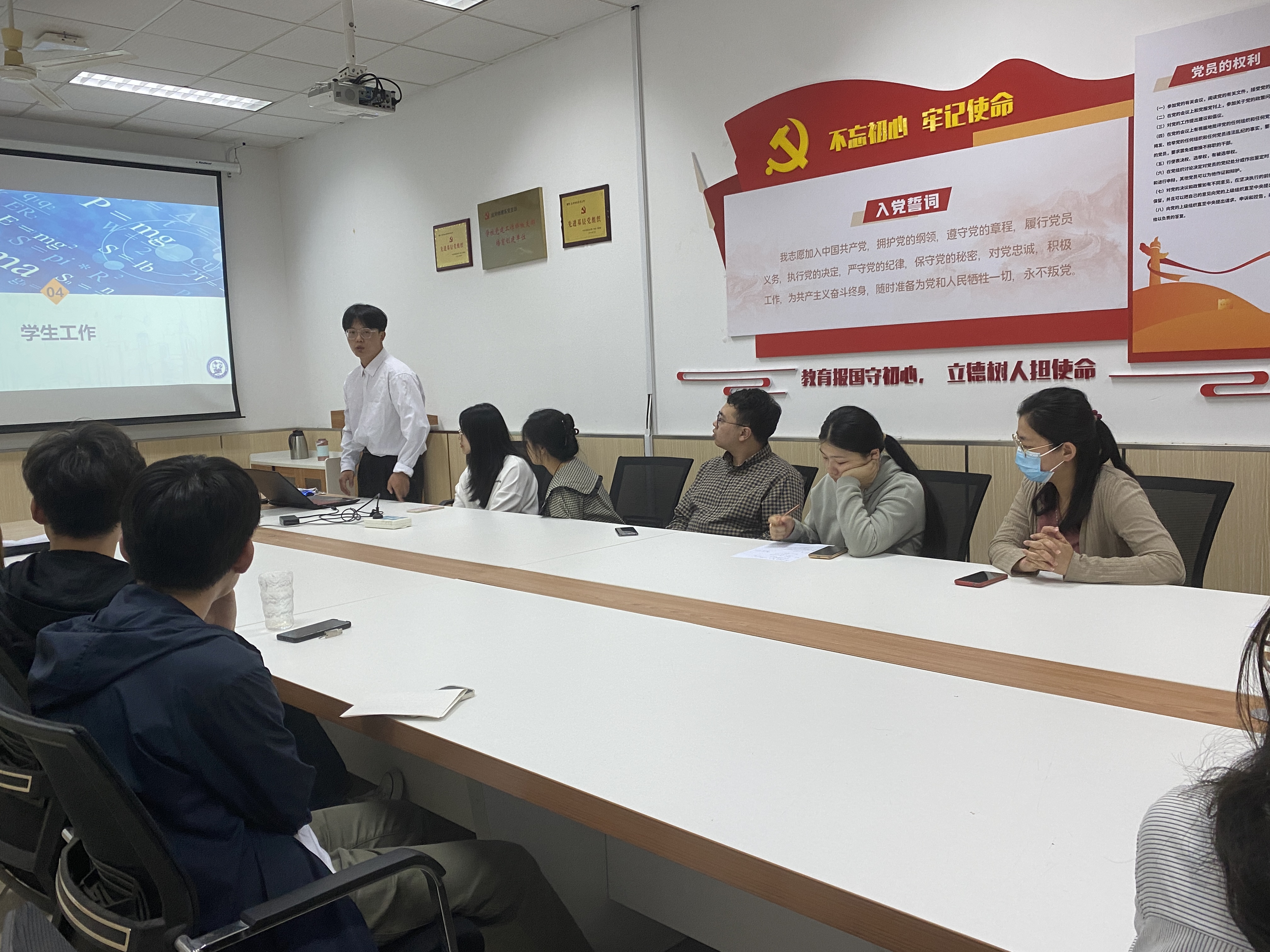 为加强党的队伍建设,充实党的新生力量,10月11日晚,研究生物理学生党支部于基础实验楼C307举办了2021年下半年发展对象推优大会。本次会议由党支部书记孙淑怡同志主持,本支部正式党员、预备党员及符合推优条件的入党积极分子参加此次推优大会,辅导员田方受邀参加。本支部应到25人,实到24人,其中正式党员应到9人,实到8人,出席人数符合开会要求。
