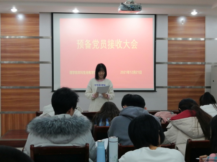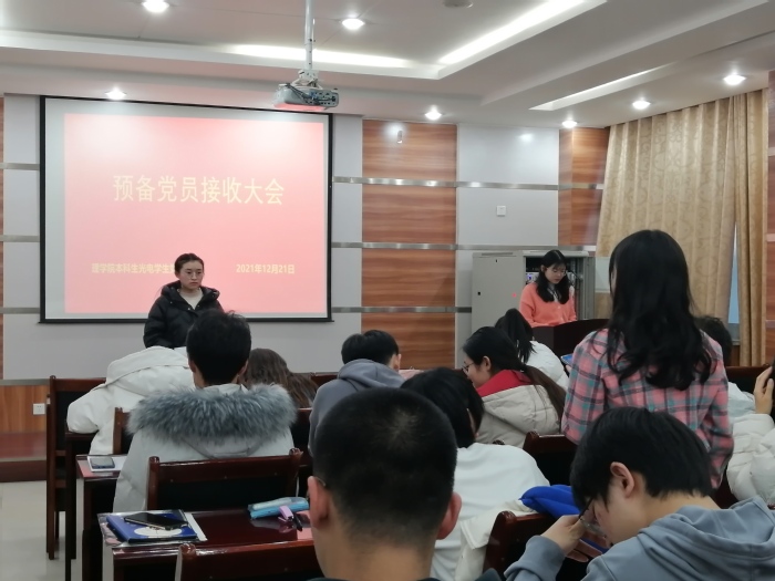 2021年12月21日下午16:00-17:50,必赢线路检测中心光电党支部全体成员在文理楼254开展光电党支部预备党员接收大会暨12月生活组织会。预备党员接收大会出席人员27人,正式党员11名,会议应到27人、实到27人。由乔良欣主持会议,严格按照组织程序进行。
