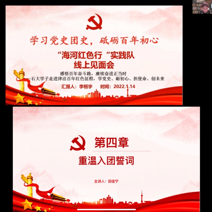 1月15日晚,实践队通过线上的方式开展了“海河红色行”实践队启动仪式。会上,由田佳宁同学带领大家重温入团誓词。田佳宁从五四运动开始讲起。对当时的历史背景、社会情况进行了详细地介绍,让队员们身临其境,进一步感受到青年人的使命与担当。其次,实践队队员们重温了团歌和入团誓词。通过本次重温誓词,实践队员们更加深刻认识到作为青年一代所担负的神圣使命,要以青春之我、奋斗之我,在自己的专业领域展现青年人的风采。