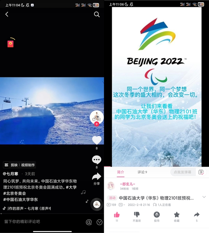 此次活动考虑到国内疫情形势以及时值寒假,活动于线上举行。活动第一项,同学们录制视频,用“我在XX,预祝2022北京冬奥会圆满成功!”与家乡合拍,为奥运健儿助力加油,视频合集在抖音、哔哩哔哩等视频平台发布,利用新媒体形式,汇聚全国各地学子的精神力,传递青年力量。