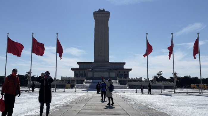 1月20日,实践队来到天安门广场,首先映入眼帘的是挂在天安门城楼上的毛主席像,它昭示着这位革命领袖“看苍茫大地,谁主沉浮”的豪情壮志!穿过地下通道,便来到了人民英雄纪念碑,那高的大纪念碑矗立于首都的中轴线上,一个个鲜红的名字浮现在眼前——那个金戈铁马的年代,那个为民族独立抛头颅洒热血的年代——那是革命先烈用鲜血和生命换来的胜利!