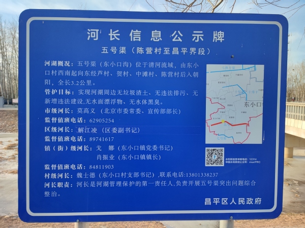 实践队员来到奥北规划区域南部东西走向的五号渠沿线,发现沟渠近期经过整治,横截面呈标准的倒梯形,顶宽10米,深3米有余,底部土地平整,有疏通拓宽的印记。渠边的水利设施公示牌清楚地注明了河渠名称、长度、治理标准和负责人姓名及联系方式,接受市民监督,确保责任到人。