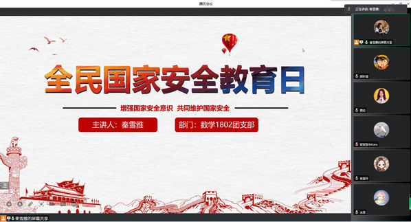 理科实验班1802班班委通过线上直播组织安全教育主题班会活动,班级全体学生参加。本次活动前,学生积极搜集相关宣传材料。在班会上,班委周新秀建议学生对照学校的规章制度,查找自身不足。之后,本班学生互相交流,讲解自身对国家安全的认识。此外,其他班委成员还分享《国家安全法》、《反恐怖主义法》以及《反间谍法》等国家安全相关法律法规,帮助学生掌握国家安全知识,提升国家安全意识,自觉维护国家安全。
