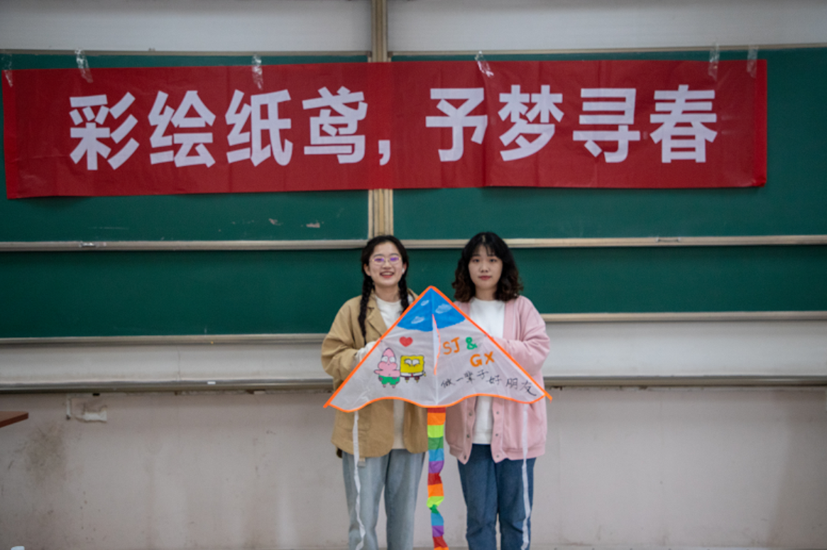活动开始于下午两点半,在活动现场,大家根据事先设计好的简笔画,现场进行绘制工作。虽然纸鸢实际的材质与形状给同学们带来了一定的难度,但正因为如此,增加了活动的挑战性与趣味性。同学们2至3人一组,纷纷发挥自己的创意,用笔、颜料和自己的智慧为风筝增色添彩,有的忙着勾边,有的忙着调色,有的忙着上色。大家玩的好不开心!绘制的风筝充满春天的气息、青年的活力、战胜疫情的希望:以“春色”为主题,渲染春的灵动生机;以“抗疫”为主题,歌颂抗疫战士的奉献等等。
