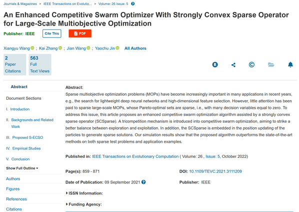 近日,我院王健教授科研团队在稀疏大规模多目标优化方向取得重要进展,相关成果S-ECSO和ST-CCPSO分别发表在进化计算领域T0顶级期刊《IEEE TRANSACTIONS ON EVOLUTIONARY COMPUTATION》、《Swarm and Evolutionary Computation》上。论文第一作者为我校硕士生王翔宇,我校王健教授和欧洲科学院院士金耀初教授为通讯作者。该研究工作得到国家自然科学基金、中国石油大学研究生创新基金等项目资助。