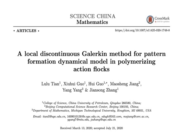 题为《分子肌动蛋白斑图动态模型的局部间断有限元方法》(A local discontinuous Galerkin method for pattern formation dynamical model in polymerizing action flocks)成果发表于国内数学领域顶级期刊Science China-Mathematics。我院田璐璐博士为该论文第一作者,郭会教授为通讯作者,硕士生郭秀惠参与工作,中国石油大学(华东)为第一署名单位。