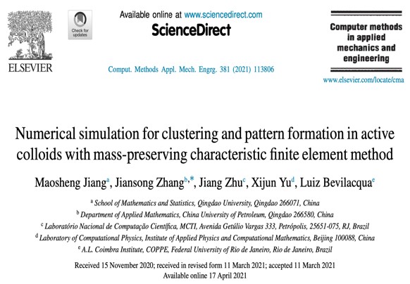题为《活性分子群聚集斑图的质量守恒的有限元方法数值模拟》(Numerical simulation for clustering and pattern formation in active colloids with mass-preserving characteristic finite element method)的成果发表于国际计算力学领域顶级期刊Computer Methods in Applied Mechanics and Engineering上。青岛大学的姜茂盛博士为该论文的第一作者,我院张建松副教授为通讯作者。