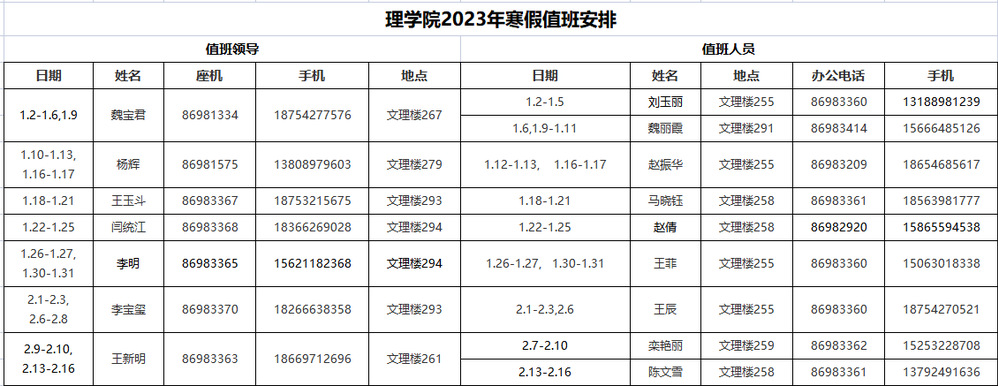 二、学校寒假安排。寒假时间为2023年1月1日至2月18日,学生2月18日至19日返校报到,教职工2月17日(周五)开始上班。放假前,各单位要做好学期末的各项工作和放假期间的安排。寒假期间,教师和实验人员在完成好教学工作、做好假期值班工作的前提下,随所任课的专业年级休假。校机关、教学院(部)机关和业务单位实行假期轮休制度,各单位要安排好值班,不能停运的单位要提前做好安排。各单位于2月16日前完成开学准备工作。