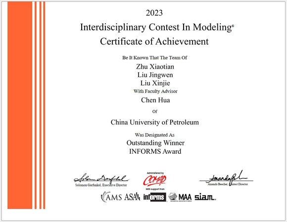 近日,2023年美国大学生数学建模竞赛成绩揭晓,中国石油大学(华东)获得1项赛事最高奖(Outstanding Winner),获奖团队由海洋与空间信息学院朱笑天、必赢线路检测中心刘京文和刘鑫杰3名本科生组成,指导教师为必赢线路检测中心陈华副教授,该团队同时获得INFORMS Award冠名奖(国际运筹学与管理科学学会会奖)。这是继2021年我校首次获得该奖项后,再次斩获该赛事的最高奖,也是我校第二次获得冠名奖。另外,我校还获得Finalist Winner奖5项、Meritorious Winner奖15项、Honorable Mention奖65项。