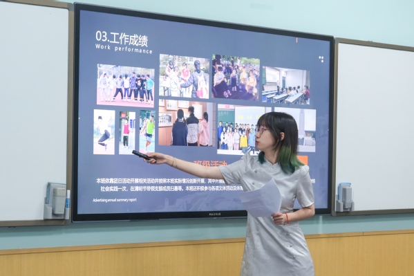 会上,各班班长、团支书依次对近一年的班级建设工作情况进行汇报。汇报内容主要包括班级基本情况、学风和班风建设、班级风采、工作反思以及未来规划等。