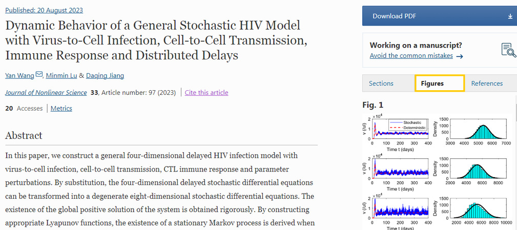 针对CTL免疫应答机制,蒋达清教授团队构建一类具有CTL免疫应答和分布时滞的随机HIV病毒动力学模型,提出模型分析的新理论,预测病毒感染的未来发展趋势。该研究成果发表在中国数学会二区期刊、中科院SCI二区期刊Journal of Nonlinear Science上,受到了审稿人的高度评价。王艳老师为第一和通讯作者,蒋达清教授为合作作者。