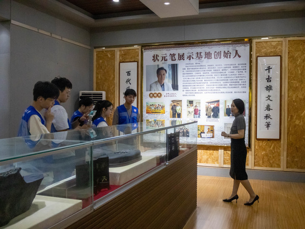 实践队员在听讲解员讲解毛笔历史 张喜策摄