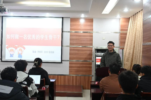 会上,张栩赫针对学生干部职责,介绍了“1+1+1”活动模式,真正做到“全心全意服务同学”。在保证个人学习成绩的前提下,张栩赫建议学生骨干着重提升策划与宣传能力,并以“多看、多学、多想、多问、多做”对本次培训做出总结。