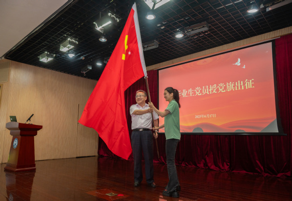 杨辉为毕业生党员授党旗出征 王一龙摄